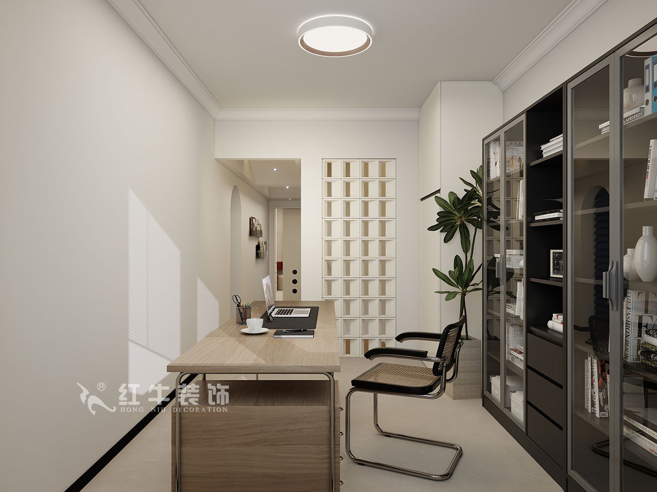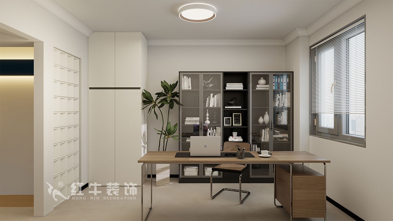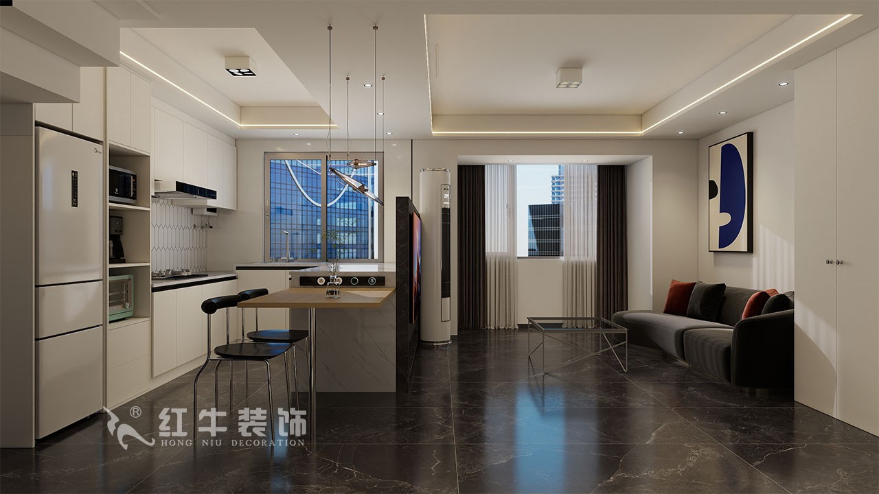 樓上下,通過(guò)溝通,一樓不保留衛(wèi)生間的功能,就把餐廚設(shè)計(jì)為一體,利用島臺(tái)的半墻做一個(gè)背景墻,完成空間的融合,沙發(fā)和柜子在一個(gè)面,整潔規(guī)整,增大空間感;二樓的書房設(shè)計(jì)開(kāi)放式的,設(shè)計(jì)中用軟隔斷進(jìn)行分割。